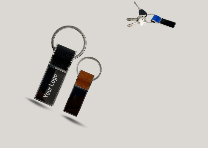 Customized Brown, White, and Blue Leather Keychain with Logo