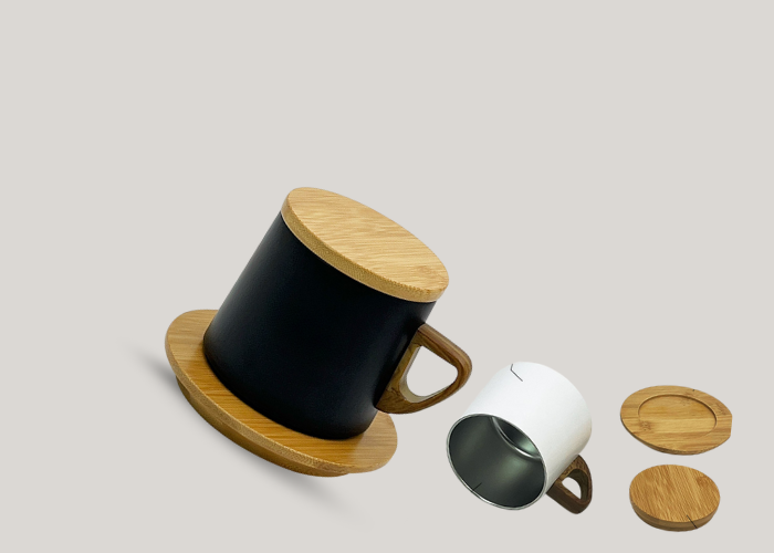 Customized Stainless Steel Vacuum Tea & Coffee Mug with Wooden Lid and Saucer